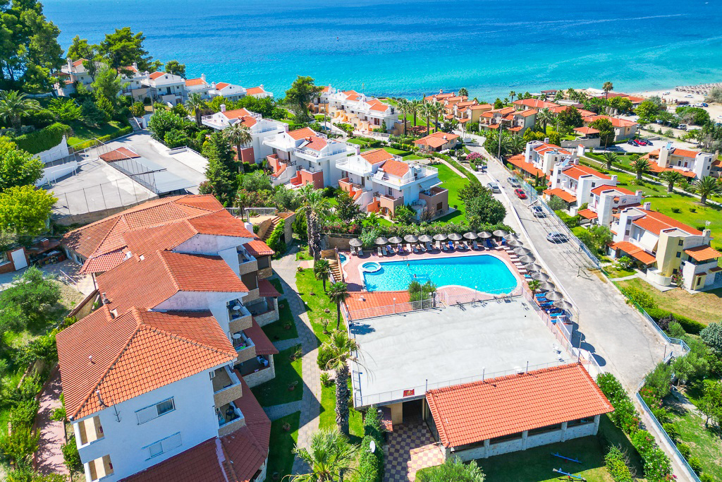 Хотелот Краун 3* е лоциран на самиот брег во Неа Скиони, со сопствен бар и лежалки на плажа кои се бесплатни за гостите на хотелот. Хотелот со својата единствена позиција ви нуди можност за релаксиран одмор во природа, со многу зеленило и директен поглед на море од секаде, на само 350м од центарот на Скиони, рибарско селце полно со традиционални таверни и ресторани каде што можете да пробате свежа риба и морски специјалитети или традиционална грчка кујна. Хотелските соби се комфорни, модерно уредени, секоја со сопствеаи бања и тераси со директен поглед на море.